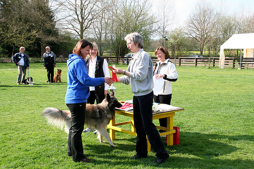 Schon relativ am Anfang waren wir mit den Gruppenübungen (unsere Wackelübungen!) dran: Ich glaube, ich war ganz schön blass, bevor wir auf den Platz gingen. Ich hatte solch ein Herzklopfen und habe nur gehofft, dass ich nicht dort auf dem Platz umfallen würde. Erst als wir uns, bei den Sitzübungen, von den Hunden entfernt hatten und uns umdrehten und mein kleiner grauer Tervueren sich immer noch nicht hingelegt hatte, konnte ich mich wieder ein wenig beruhigen. Als dann diese Minute zu Ende war und er immer noch saß, konnte ich schon hier meine Freude nicht verbergen: 9 Punkte! Das „Liegen“ war dann schon gar nicht mehr so schlimm für mich. Er war erwartungsgemäß ein bisschen unruhig: 7,5 Punkte. Nach diesen beiden geschafften Übungen ging es mir sooooo gut und meine Freudentränen konnte ich nicht verbergen: Für mich war die Prüfung schon hier, an diesem Punkt ein riesig großer Gewinn! Ich bin so stolz auf meinen „Great Boy“!